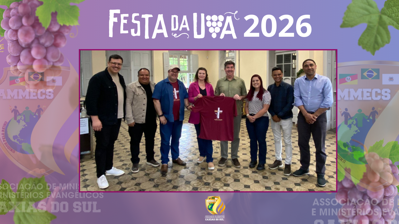 Participaram do encontro o presidente da AMECS, Pr. Paulo Lima, o secretário da entidade, Arno Quevedo, o vereador Calebe Garbin (PP), o cantor gospel Diego Silva, o jornalista Lairton Fonseca e a pastora Milca Julianote, estes últimos integrando a Comissão da Noite Gospel da Festa da Uva 2026. Também estiveram presentes a secretária municipal da Cultura, Tatiane Frizzo, e o presidente da Festa da Uva 2026, Fernando Bertotto, reforçando o apoio institucional à iniciativa.
